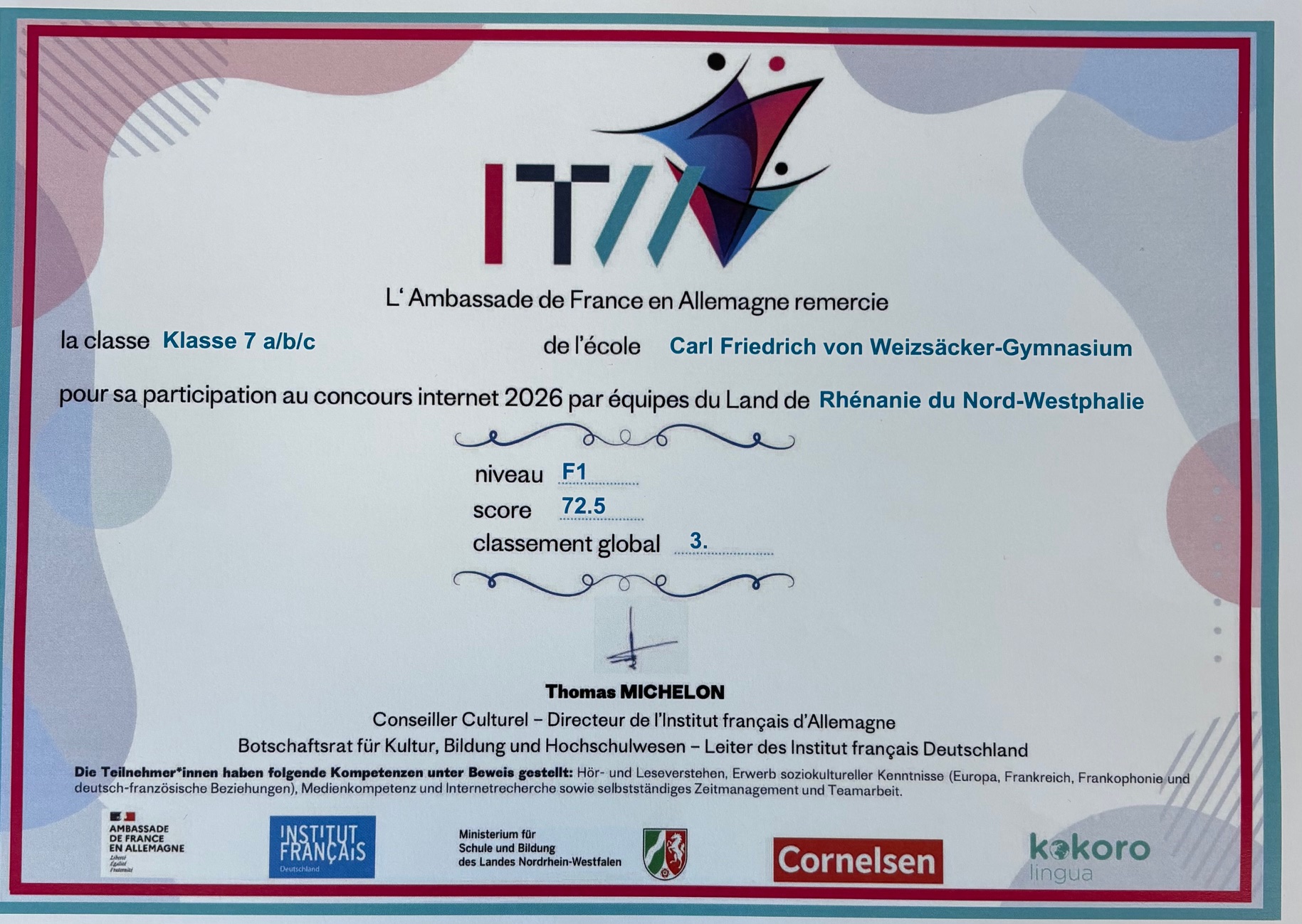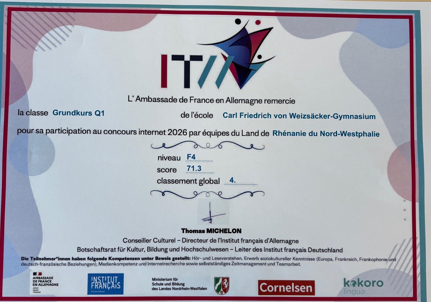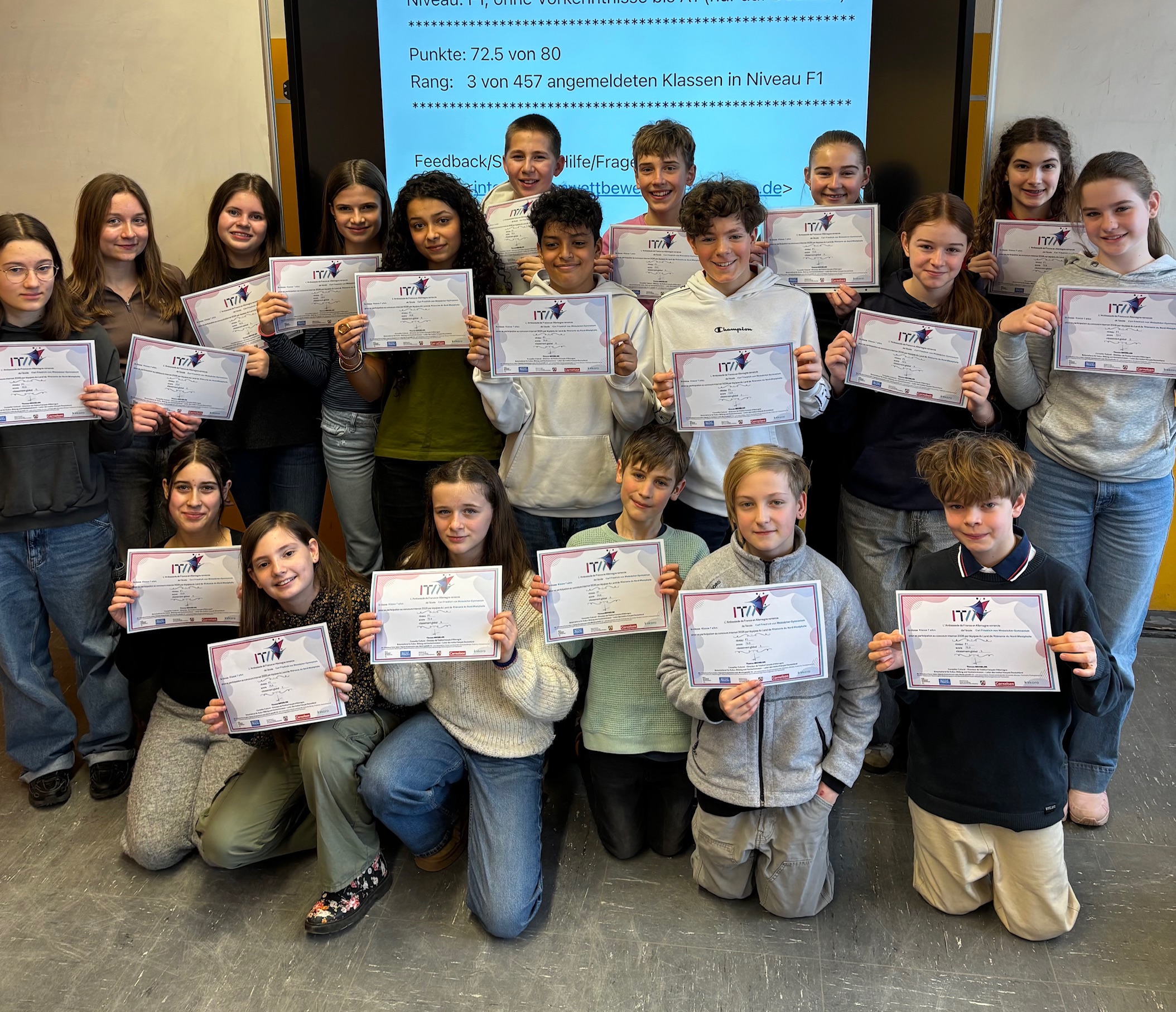 Am deutsch-französischen Tag im Januar nahmen fast alle unsere Französischkurse am Internetwettbewerb des Institut francais teil. Es wurden 80 Aufgaben intensiv bearbeitet, recherchiert, überprüft und viel neues Wissen über Frankreich entdeckt. Nach drei Stunden Arbeit waren sich alle einig: Es war anstrengend, hat aber auch viel Spaß gemacht! Jetzt kamen die Ergebnisse und zwei Kurse haben Grund zum Jubeln: Der Kurs der Klassen 7a/b/c kam auf den dritten Platz von 457 (!) teilnehmenden Klassen im Niveau F1 (Anfänger) und der Q1 Grundkurs wurde im Niveau F4 (Grund- und Leistungskurse der Oberstufe) Vierter von 179 Kursen!