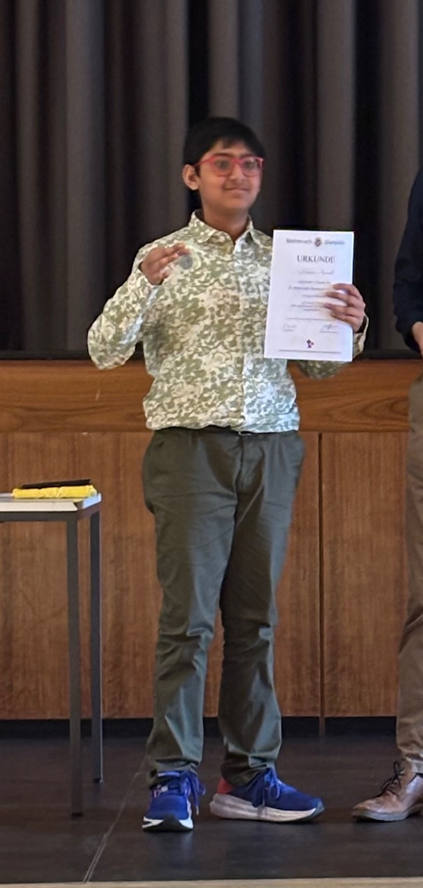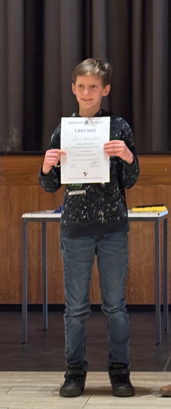 Nach zwei Runden Mathematik-Olympiade, in denen unsere Mathe-Asse zeigen konnten, was sie drauf haben, wurden nun die Preise auf Kreisebene vergeben und wir sind stolz auf vier Preisträger aus unserer Schule: Anton M. und Jonas B. aus der 5c, Jiahao P. aus der 6c und Sohan N. aus der 8d rechneten, kombinierten und lösten die Aufgaben so gut, dass sie für ihre Leistungen geehrt wurden. Sohan qualifizierte sich außerdem für die nächste Runde, den Landeswettbewerb, für den wir ihm ganz viel Erfolg wünschen!