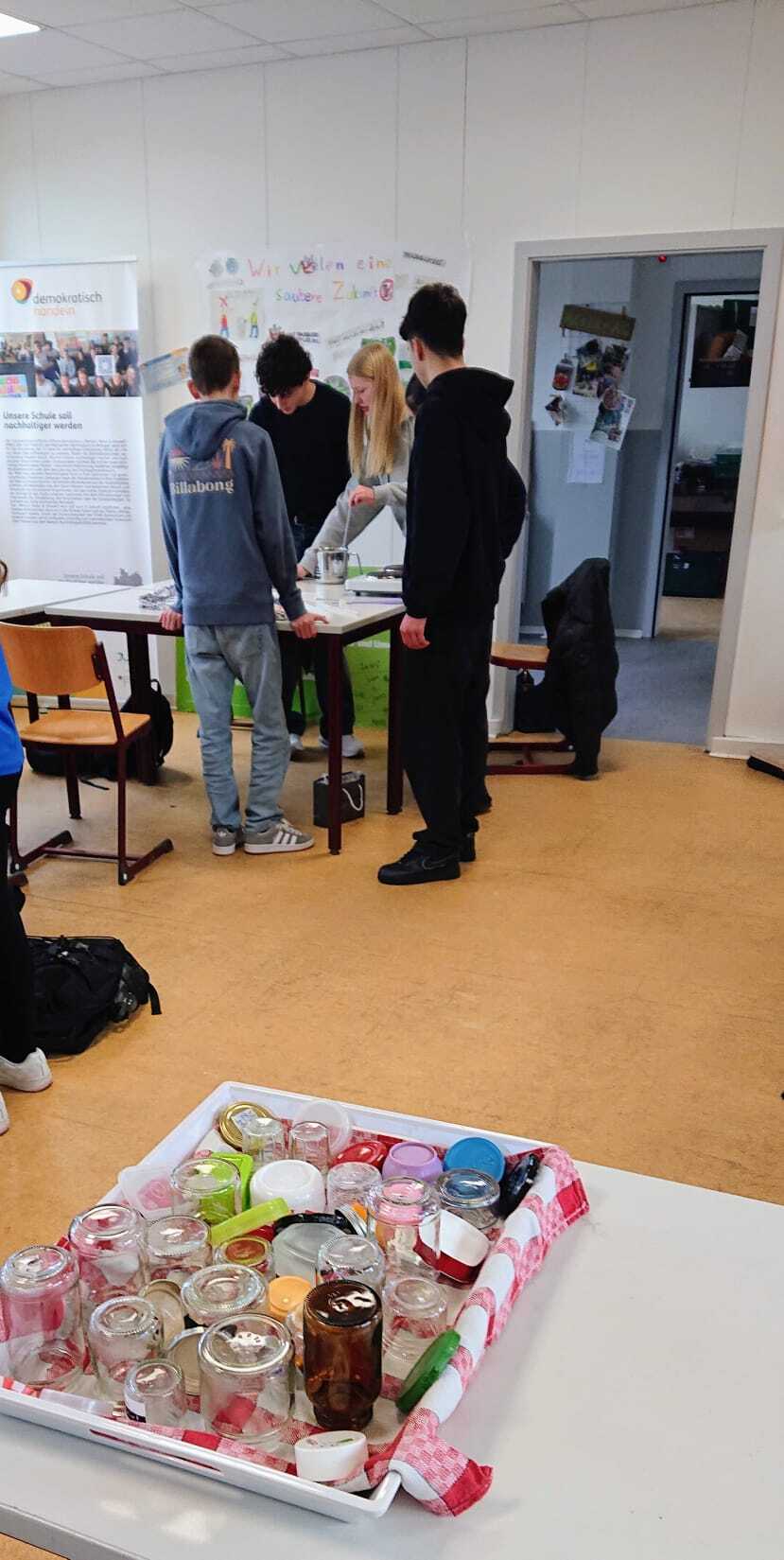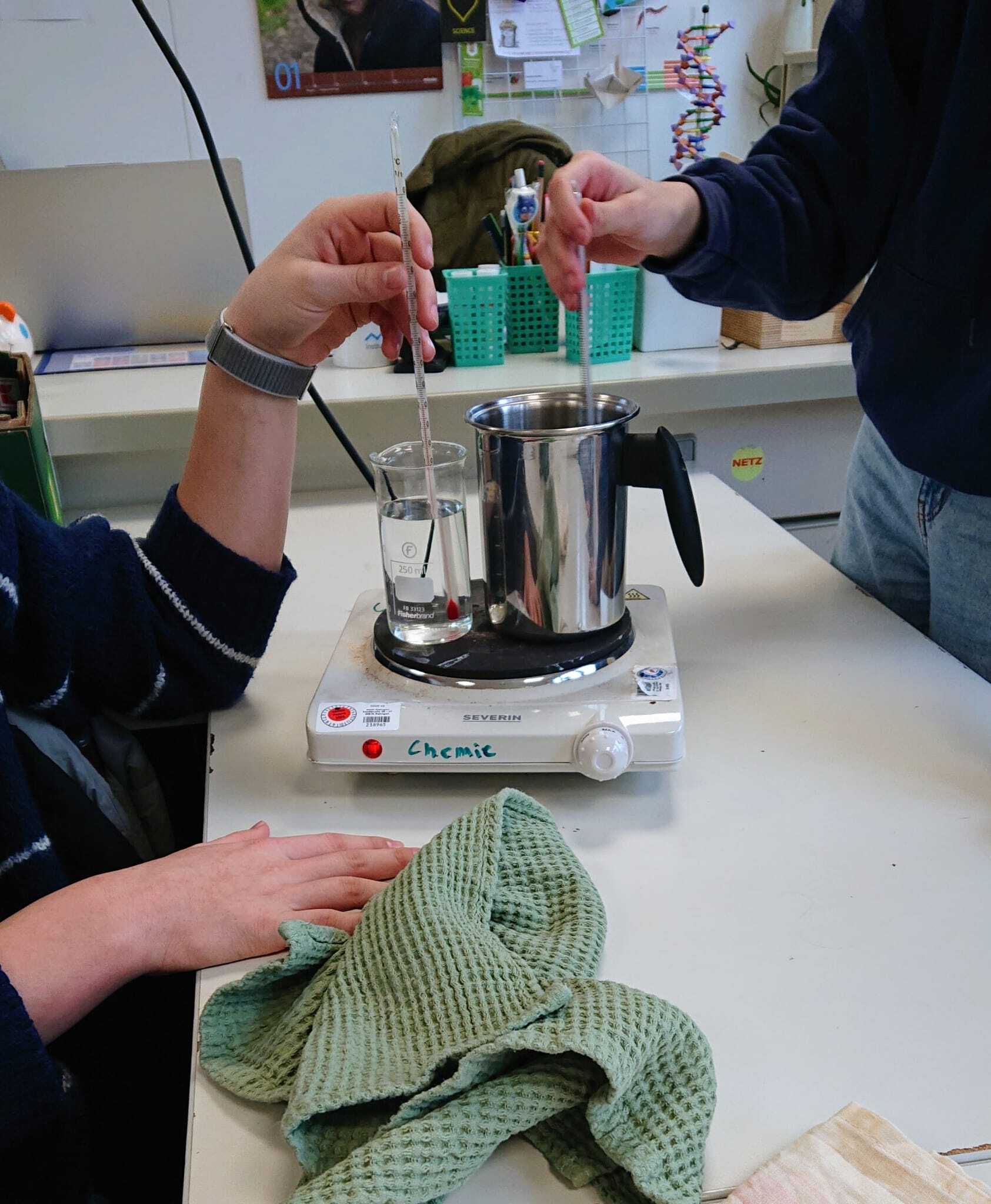 Zum Abschluss des Halbjahresthemas „Haut“ im naturwissenschaftlichen „Mensch, Natur & Umwelt“-Kurs der Klasse 9 stellten die Schüler:innen eigene Hautcreme, Lippenpflege und festes Deo her. Dabei konnten grundlegende Inhalte wie die Eigenschaften von Wasser-in-Öl- und Öl-in-Wasser-Emulsionen sowie die Funktionsweise von Emulgatoren anschaulich und praxisnah erklärt und nachvollzogen werden.